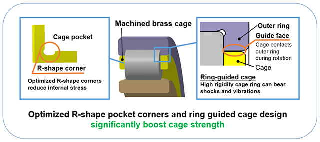 Gearbox bearings are subjected to intense shocks and vibrations from the tracks, so cage strength is vital to ensuring high reliability operation. Drawing on vast experience designing bearings for railway applications, NSK has developed a special ring-guided cage with optimized pockets employing “R-shaped corners.” The novel design reduces stress in the cage structure by 75%.