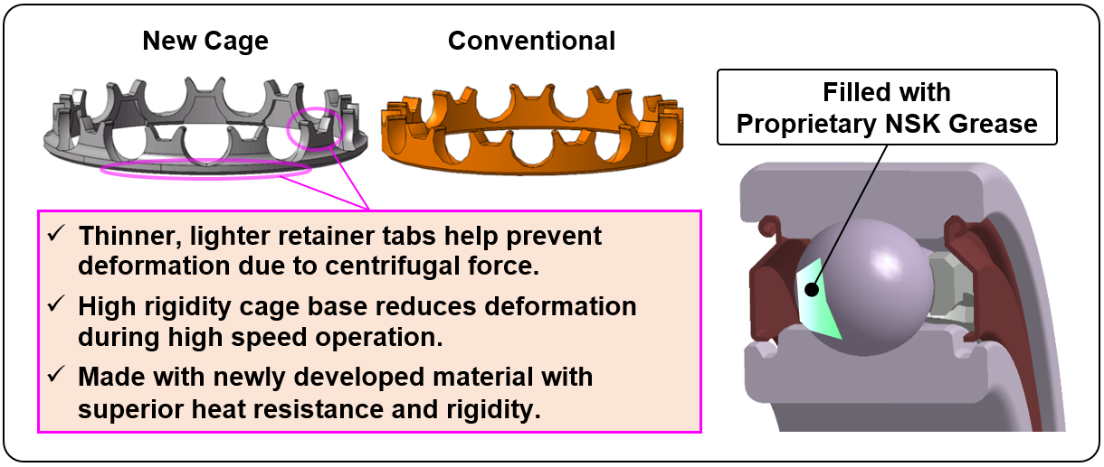 Proprietary NSK grease and newly developed cage enable bearing operation at dmN1 = 1.4 million (e.g. 35 mm bore diameter bearing at 30,000 RPM).