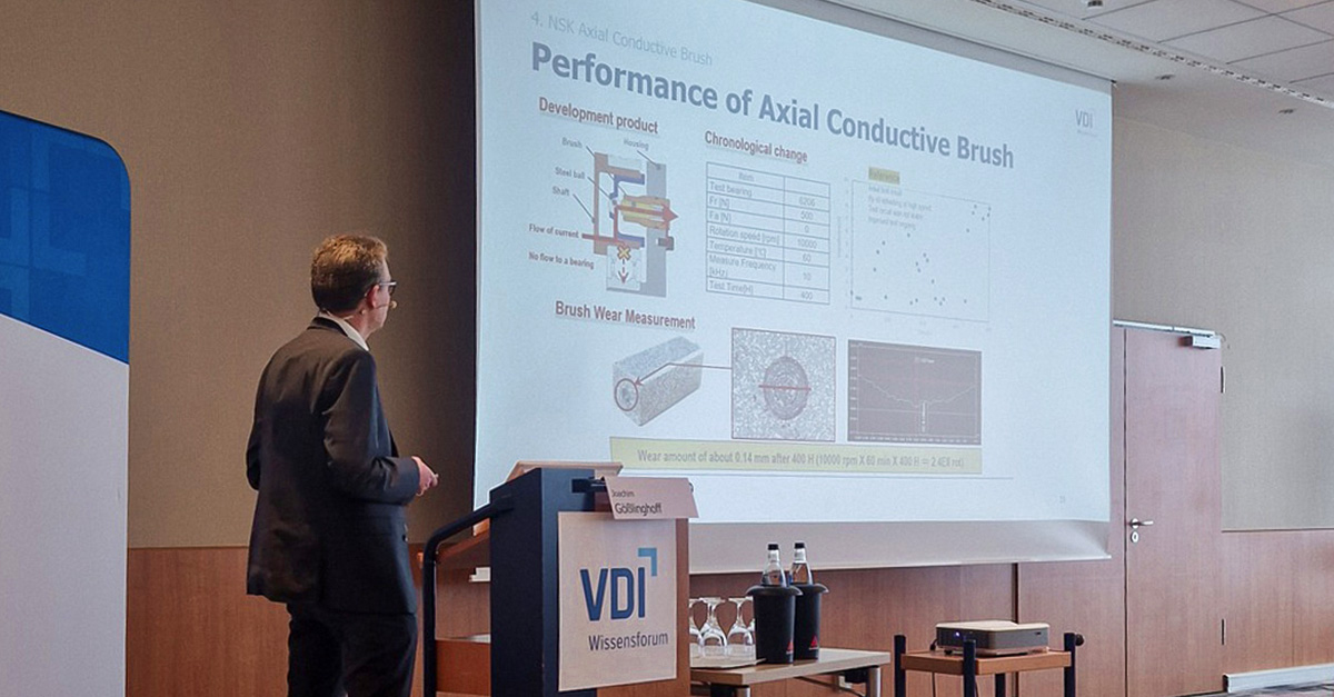 NSK presented at VDI Conference in Aachen, Germany “Asking yourself how to reliably conduct current in an oil #environment? Her is the answer: NSK has developed an innovative Axial Conductive Brush, consisting of two sub-assembly parts, which can complementary be used with any insulated bearing, like the NSK plastic overmolded #bearings. This combination is also required to prevent electrical erosion failures at non-insulated bearing positions, especially in case of a circulating current. The essential feature of the #NSK axial conductive brush is the stable function even in oil-lubricated conditions, compared to existing radial brush solutions, which are stable in dry conditions only. In case of not sufficient space available for the Axial Conductive Brush solution, NSK-Warner, a longstanding NSK-joint venture with Borg Warner, is also able to offer an Electrical Bypass Plate (Conductive Paper) solution, which is also based on an axial contact, but not located at the axis center line as it is for the Axial Conductive Brush, the latter with the big advantage of nearly no peripheral speed in the contact area. When interested in the above and our new NSK product, please don't hesitate to contact Dipl.-Ing. Joachim Gößlinghoff from NSK Europe [email protected]. He is Engineering Manager Powertrain and presented the NSK Axial Conductive Brush at the VDI Tagung Schadensmechanismen an Lagern 2024 in Aachen.