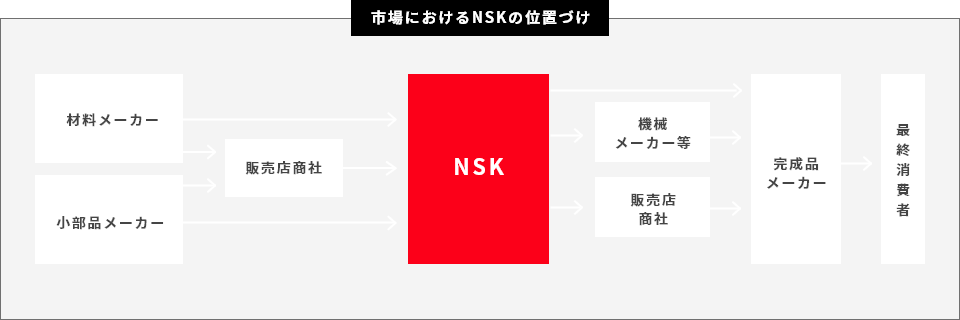 1916年、日本初のベアリングメーカーとして誕生したNSKは、現在国内シェアNo.1、世界シェアNo.3のポジションを築いており、総合ベアリングメーカーとして、幅広い分野でのニーズに応えています。ベアリングは、見えない場所で活躍しているため目にすることはなかなかありませんが、私たちの暮らしの中で驚くほどたくさん使用されており、機械が安定して能力を発揮するために必要不可欠な部品です。世界の産業をリードし、円滑で安全な社会を築くためにNSKはあたらしい動きを生み出し続けています。